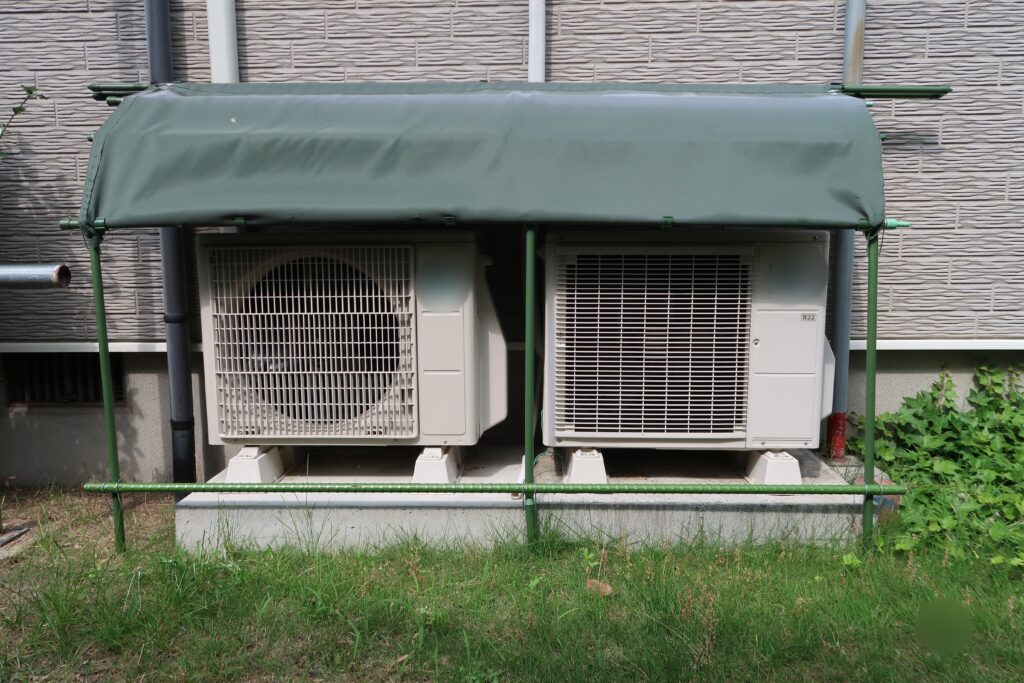 エアコンの室外器に直射日光が当たるのをなんとか防ぎたい、室外機に直射日光があたればそれだけ熱効率が悪くなるだろう・・と・素人は考えた。通販で販売されているのは、室外機に直接取り付ける方法なので、暑い時に冷たくしたいし、寒い時に暖かくしたい! する室外機機械本体とカバの間に空間を作りたかった、次に雨や雪を室外機に直接あてたくなかった、空間がほしかった。