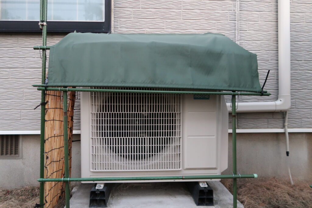 室外機カバ-の骨組みは、家庭園芸のツルを巻くアルミの支柱と覆いは、ポリカポネ-トを使いその上にガ-デンシ-ト被せた。